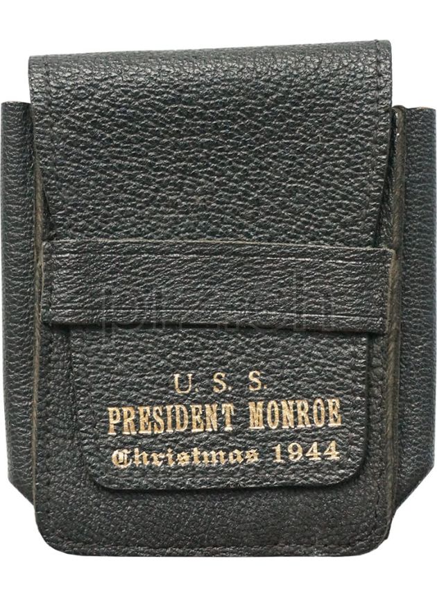Wartime leather cigarette case marked «USS PRESIDENT MONROE Christmas 1944» in inverse relief on the front flap.