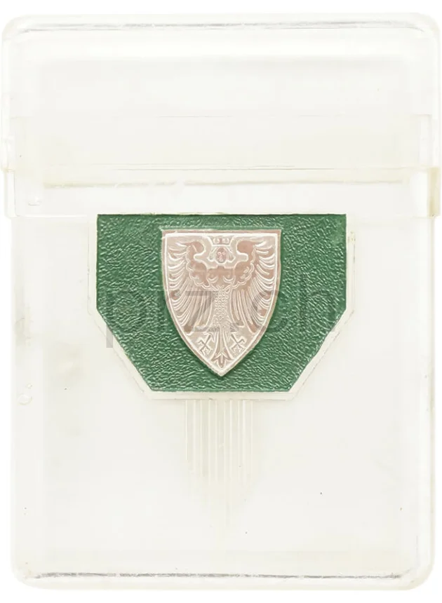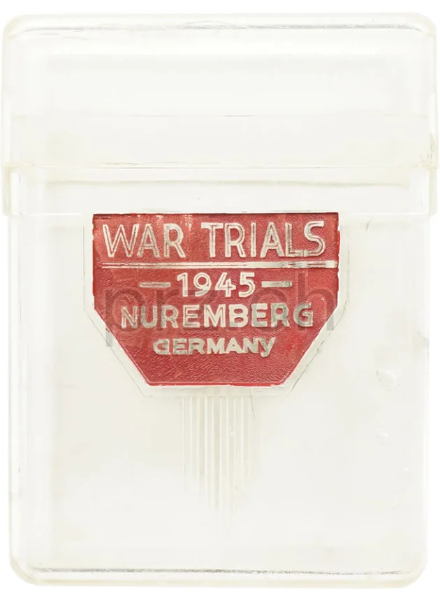 Cigarette case with a two-piece plastic body. On one side with the shield of the War Trials of 1945 and on the other side with the crest bearing a stylized heraldic eagle.