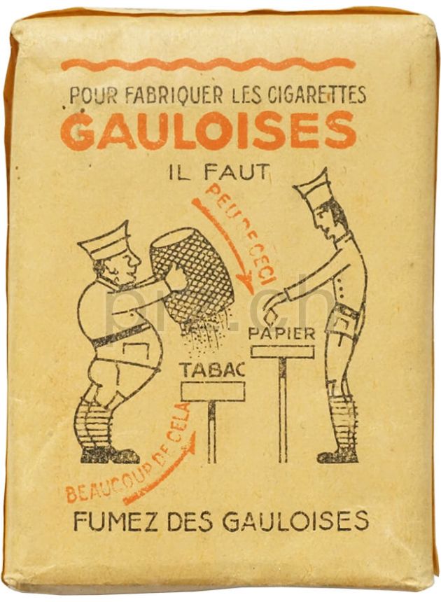 Full soft pack of 20 cigarettes for French troops from war time with tax banderole and a price quote, featuring an illustration on the back depicting two soldiers assembling cigarettes, with the caption «POUR FABRIQUER LES CIGARETTES GAULOISES, IL FAUT PEU DE CECI, BEAUCOUP DE CELA», and the instruction «FUMEZ DES GAULOISES» below.