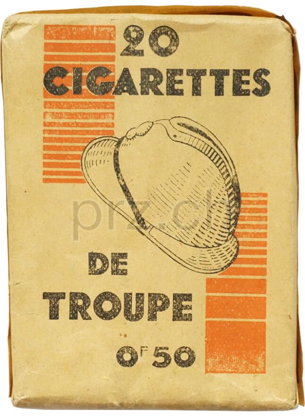 Full soft pack of 25 French Army troop cigarettes from wartime with a Canadian tax stamp. Both sides feature an image of General de Gaulle in front of the Cross of Lorraine, the symbol of the Free French Forces during WWII, along with the inscription «25 CIGARETTES LÉGÈRES GENERAL DE GAULLE». During WWII, Canada provided extensive support to the Free French Forces, including supplies like cigarettes, distributed to French troops under Free French leadership.