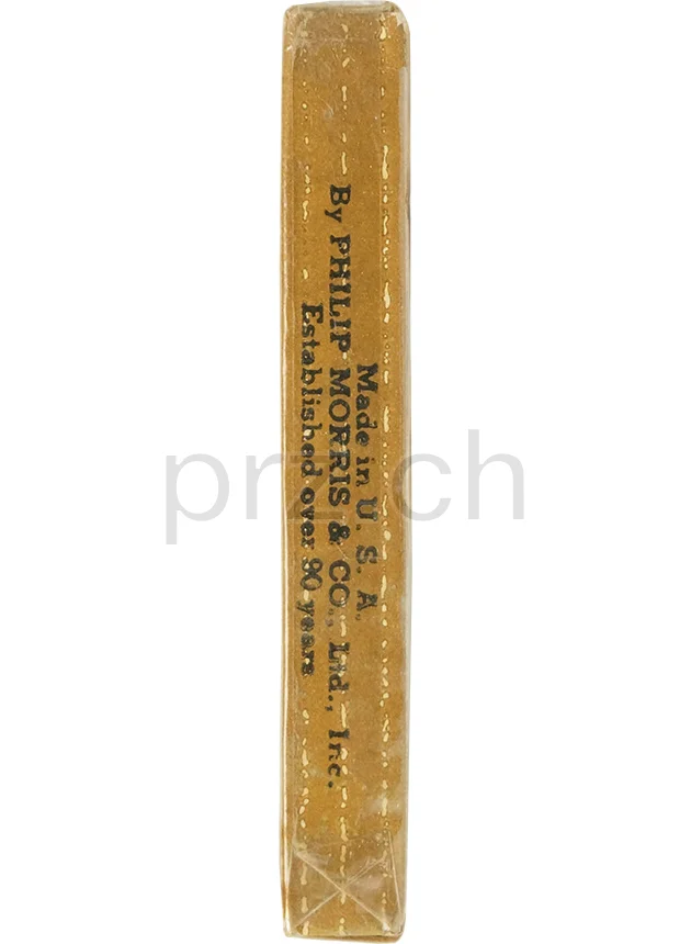 Full hard pack with 4 cigarettes from a Korean War K-Ration placed in a cardboard tray in a Philip Morris branded sleeve with cellophane wrapper.