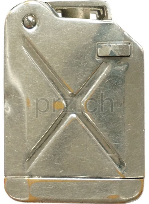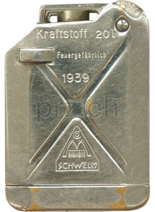 German petrol lighter produced by KW (Karl Wieden), styled after a Wehrmacht jerrycan with the distinctive pressed-steel «X» pattern on its sides. The front is stamped «Kraftstoff 20L», «Feuergefährlich» and «1939», echoing the markings found on fuel cans carried by German forces during the WWII. Below appears the manufacturer’s logo «Schwelm,» referencing the Westphalian town where original Wehrmacht fuel containers were produced.