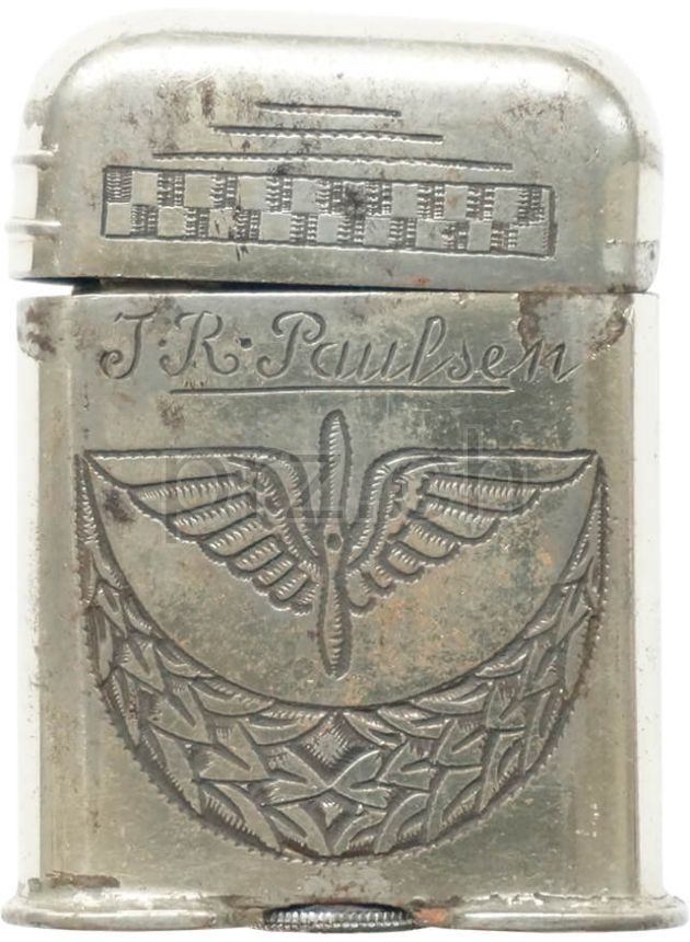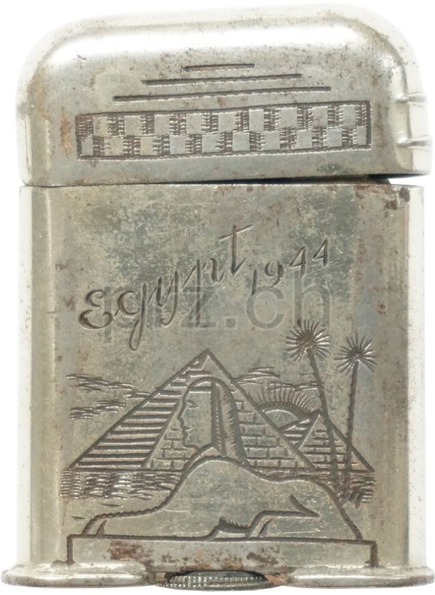 Wartime Thorens lighter engraved with the pyramids and Sphinx of Giza beneath the inscription «Egypt, 1944», evoking the North African campaign and the presence of Allied troops stationed there during the later stages of the war. The reverse is engraved with the name «J.R. Paulsen» above the Army Air Forces insignia with decorative ornamentation.
