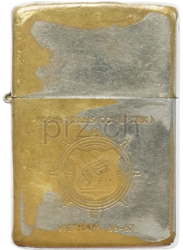 Vietnam Zippo lighter factory engraved with the text «805th Trans Co (Lt Trk)» above the U.S. Transportation Corps insignia. Below is the inscription «Vietnam 66–67», marking the unit’s service period.