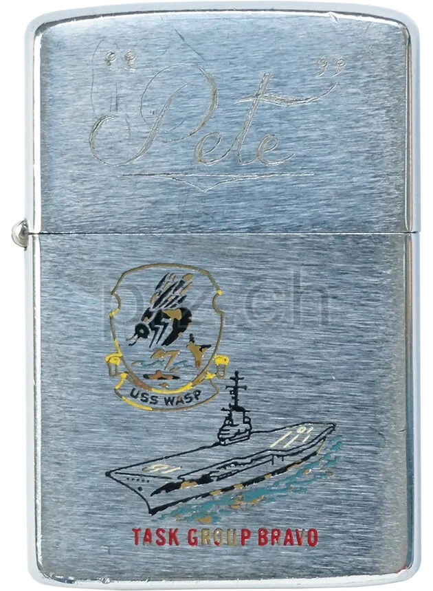 Vietnam Zippo factory engraved on the front with the ship and insignia of the «U.S.S. Wasp», with «TASK GROUP BRAVO» below. The lid is hand-engraved with the name «Pete», identifying the U.S. Navy serviceman who later also served with U.S. Navy Coastal Squadron Three during the Vietnam War era.