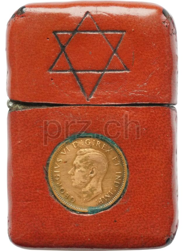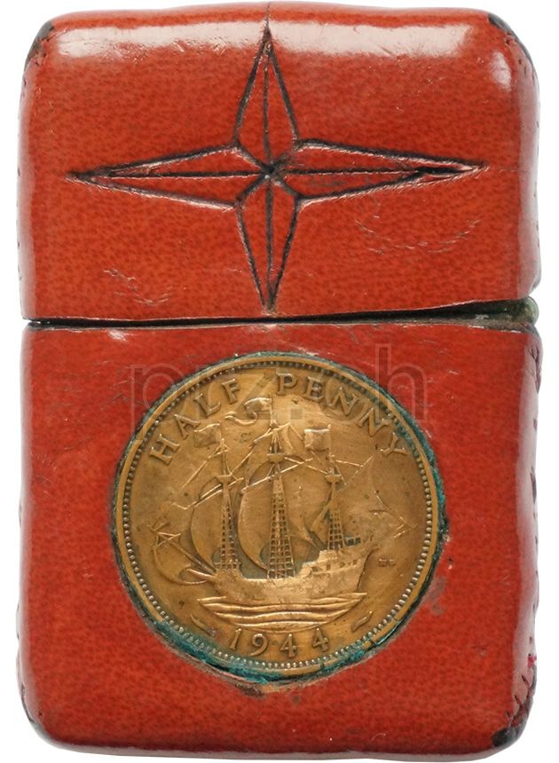 Leather wrapped Zippo with a hand carved Star of David on the lid and a George VI coin showing the king’s portrait and legend «GEORGIVS VI D:G:REX ET IND:IMP» inset on the front. The reverse carries a compass-rose engraving above a 1944 British half penny, the coin depicting Sir Francis Drake’s ship, the Golden Hind. On the bottom, the initials «MHG» appear in inverse relief.