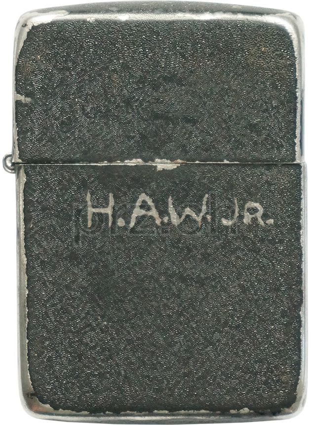 Black crackle Zippo engraved with the initials «H.A.W. JR.», belonging to Herbert A. Wisbey, Jr. I kindly received the other personal items from his family as a memento.